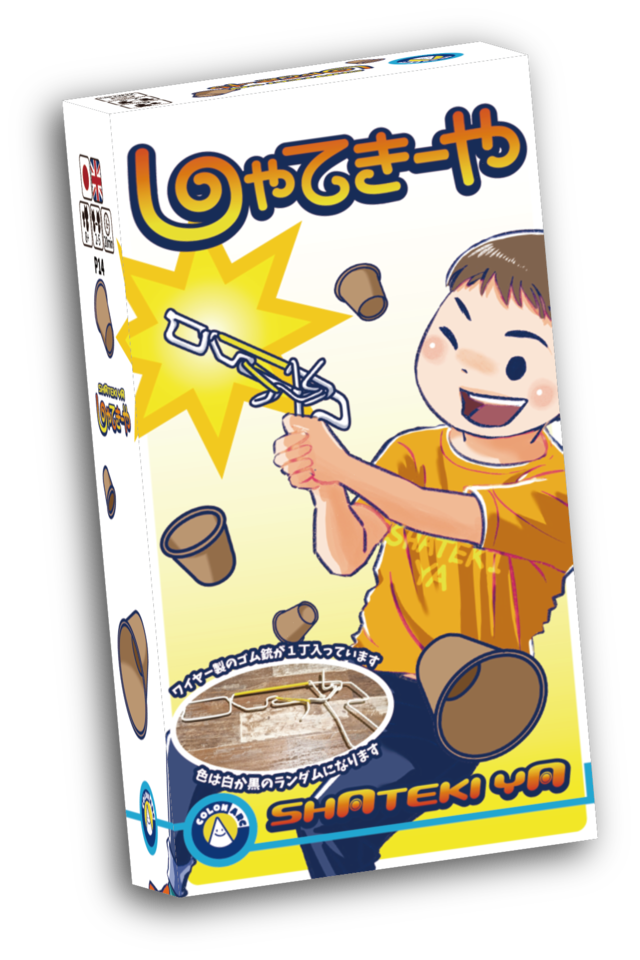 針金で輪ゴム鉄砲を作っている3ring舎さまとの協力でできたゲームです。 射的のルールを中心に、どこでも遊べます。 標的を、テーブルの上のほか、床やカーテンレールの上に置いて遊びましょう。 基本的に、射的を行い、得点を競います。 前半は3列に並んだ標的をうまく落とすゲームです。 後半は、積み上げられた標的をうまく落とすゲームです。 共に3発しか弾がありません。 しかし、1発で2つ以上落とすこともできるため、上手くねらって落としましょう。 標的となる紙コップを置く場所は自由です。 本当に自由なので、テーブルの上はもちろんのことながら、床の上、はたまたカーテンレールの上でもゲームができます。 障害物がたくさんあるような場所でも構いませんが、遮蔽物に隠れないように置いてください。 今日からお前が村一番のガンマンだ!(村? 内容物 ゴム銃1丁、輪ゴム、標的コマ(紙コップ)36個、ターゲットラインカード / シューティングカード8枚、プレイヤーコマ10個、ルール