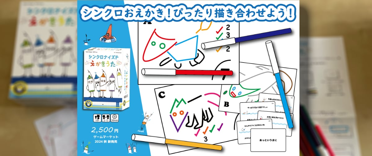 このゲームは、「えかきうた」に合わせて、それぞれでイラストを描き、シンクロナイズドスイミングのように「同じフレーズ」で「同じ個所」を描いたプレイヤー同士が得点を得るゲームです。 ゲームの進行は3つのステップで行います。 1.手番プレイヤーは、フレーズカード5枚のうち、4枚を使って、上手く「お題」となるものを描ける「えかきうた」を作ります。 「お題」も公開されます。 2.全員がえかきうた全体を見たうえで、手元の紙に絵を描きます。この時、フレーズごとに違う色のペンを使います。 3.こうしてできた絵を、フレーズごとに答え合わせして、同じ個所を描いていた人通しで、その人数分の得点を得ます。 ポイント1 お絵描きゲームですが、上手く描く必要はありません。如何に一致したイメージを持てるかです。意外な一致があるかも。 ポイント2 絵描き歌を作るのは簡単です。カードを4枚並べるだけです。それも難しい? ならランダムで並べてください。それでも遊べるのがこのゲームのいいところです。 ポイント3 このゲームは実際何人でも遊ぶことができます。オリジナルバージョンで、80人で遊んだレポートもありました。 インターネットでチャット越しに遊ぶことだって可能です。よりたくさんの人たちと遊んでみよう! 内容物 フレーズカード58枚、お題カード20枚、ペン(18色)、ブロックメモ、ルール
