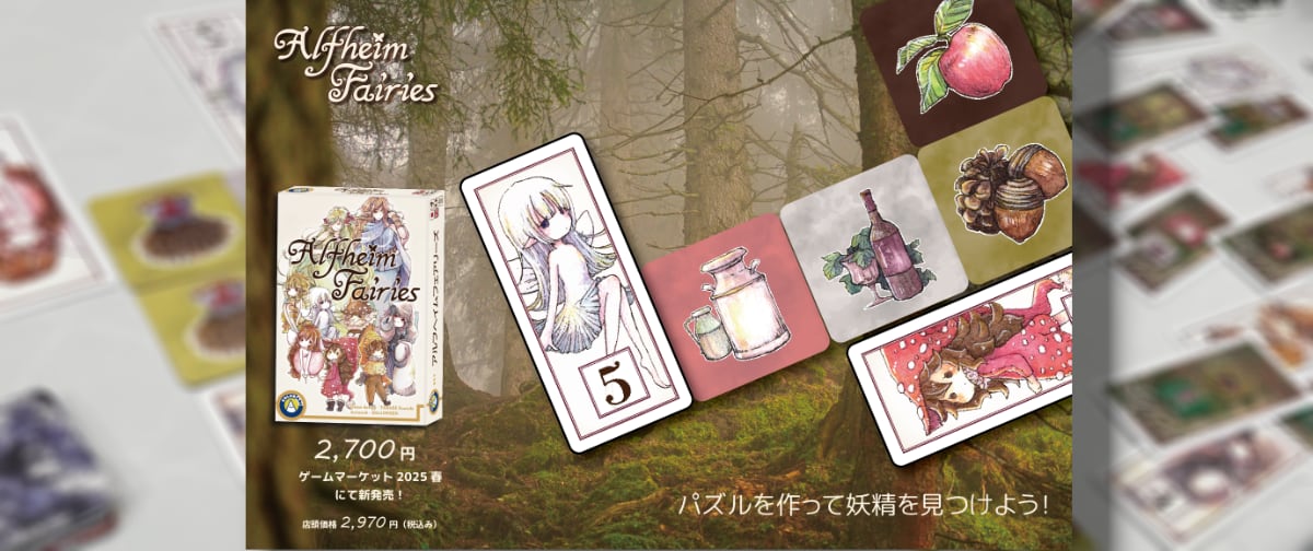 プレイヤーは調査隊となって、アルフヘイムで妖精を探します。 ゲームでは、正方形のカードを配置して、2~4枚のセットをうまく作ります。 カードは縦横につながるため、センスのある配置が求められます。 配置するのは、各自それぞれの場です。 そして、手番プレイヤーが引いたタイルと同じものを自分の場に配置します。 つまり、それぞれが完全に邪魔されることなく、パズルを楽しめます。 こうして、特定のセットを作れたら、対応する妖精を配置します。 得点なのですが、パズル的には邪魔になってきます。 こうして12ラウンド配置したら、得点計算です。 より早く妖精のセットを見つけた時のボーナスカード「エキスパートカード」や、途中で配置しなければならない「足跡カード」、そして、特別な存在、キングとトムテ(サンタの手助けをする伝承のある妖精)。 さらに、配置するカードが嫌な時は、ランダムでカードを変更できます。これもこのゲームの大きな特徴です。 ゲーム終了時には、水彩で描かれた妖精たちがたくさん自分の前に広がっていることでしょう。 みんなでじっくり、パズルを楽しみましょう。 内容物 手がかりカード78枚、妖精カード45枚、足跡カード6枚、エキスパートカード15枚、ルール