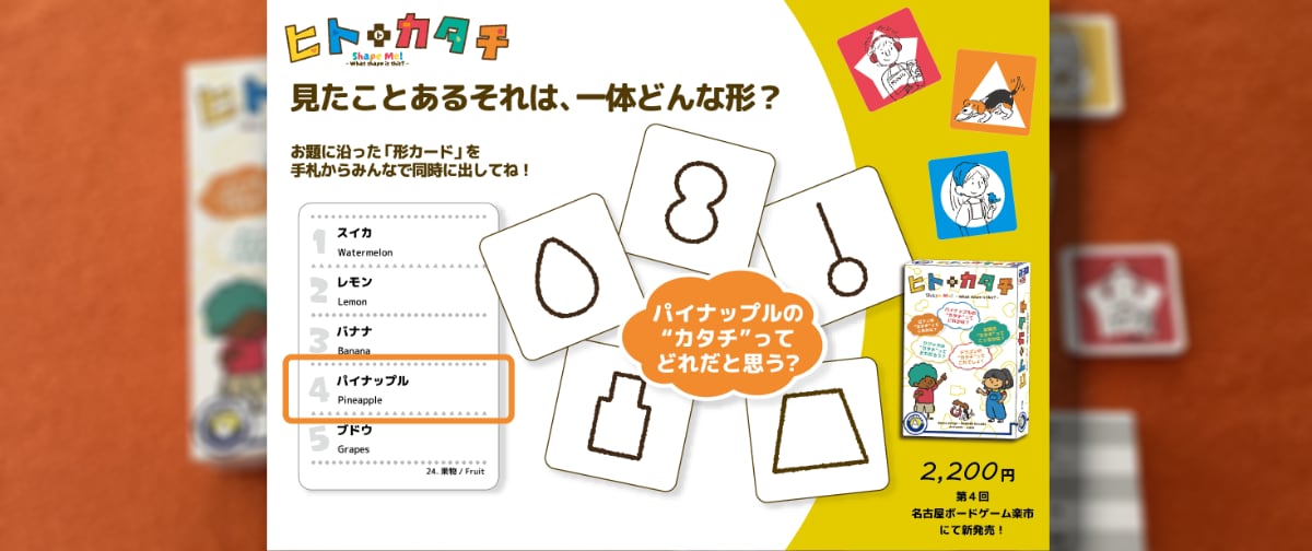 見たことあるそれは、一体どんな形!? 色を合わせる協力ゲーム、ヒトトイロから8年。今度は「形」を合わせましょう! プレイヤーは全員協力して同じ形のカードを順番に出そうとします。 どの形を出せばいいのかは、手番プレイヤーが選んだお題カードから連想できるものを選びます。でも人によってモノの印象が違うからなかなかうまくいきません。 5枚カードを裏向きに出したら答え合わせを行い、すべてのプレイヤーが順番も含めて一致していればプレイヤーの勝ちとなります。 難易度が調整可能で、より簡単に、より難しくすることが出来ます。 ☆ここがポイント! 一緒に遊んでいる人の人柄が出てしまう、形をテーマにしたパーティーゲームです。 イメージした形が同じだったら、「ですよねー」、違うことで「えー、どうしてー!?」と話も弾み、周りの人たちと仲良くなるチャンスです! 内容物 形カード96枚、お題カード60枚、ルール